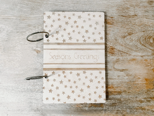 This Card Keeper is made with Baltic birch wood and is bound together with two silver 2 book binder rings.